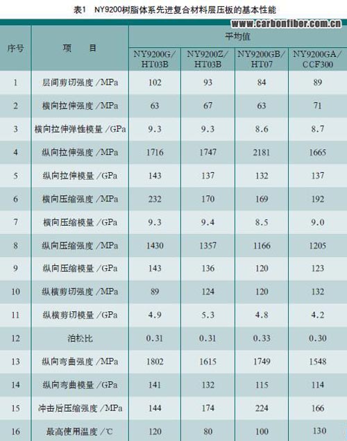 为提高和稳定先进复合材料的成型质量,降低先进复合材料的制造成本,我们根据不同的复合材料结构件研制开发了中高温度固化、韧性不同的NY9200环氧树脂体 系,原材料均为国产,价廉易购;其配制工艺简单,质量稳定,可用于湿法或干法预浸,无污染,易工程化;其预浸料具有贮存期长,固化温度带宽,固化时间短等 优点;其先进复合材料具有韧性和机械性能兼优的特